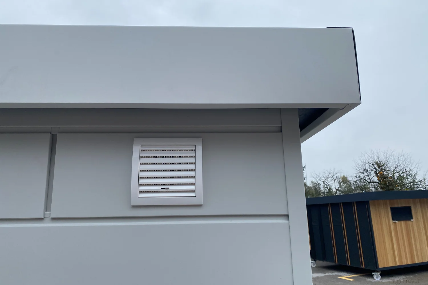 Festes Aluminiumfenster, gestrichen in der Farbe der Blechabschlüsse, mit getöntem Glas.