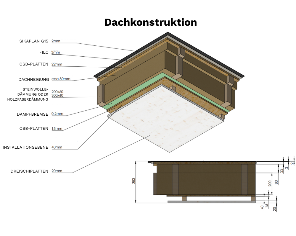 Das Bild zeigt einen Querschnitt durch das Flachdach des modularen Hauses Cubie, wo Sie jede Schicht einzeln sehen können – vom äußeren Abdichtungssystem Sikaplan über die Wärmedämmung KWH zwischen der Konstruktion bis hin zur inneren Verkleidung aus dreischichtigen Fichtenplatten. Jedes Element hat seine eigene Funktion. Jede Schicht hat ihre eigene Geschichte.