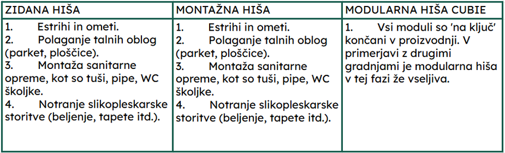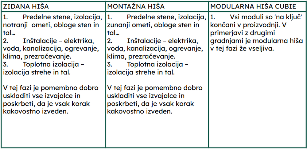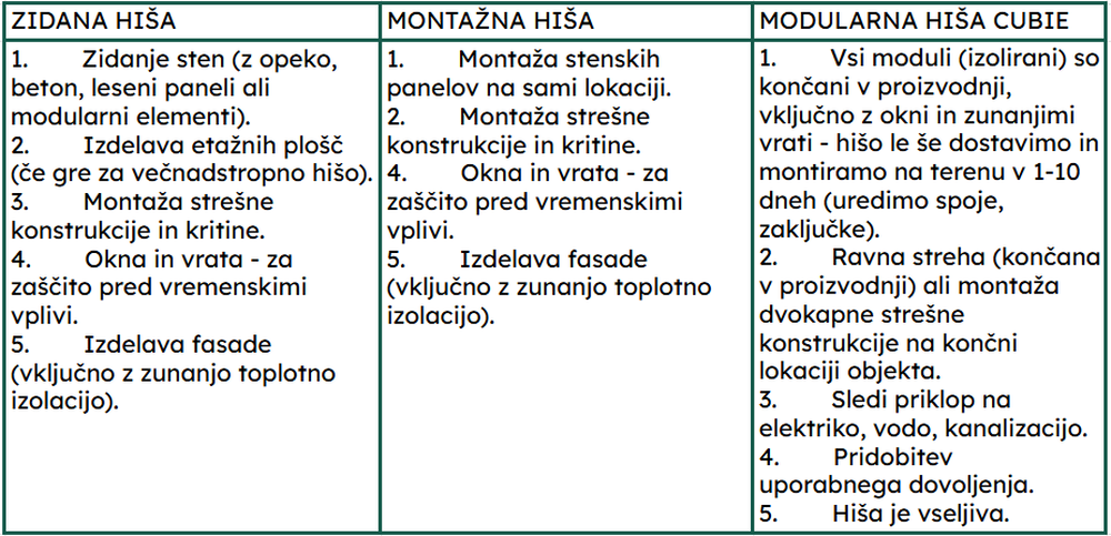 V vednost: Postopki pridobivanja dokumentacije (gradbenega dovoljenja) pred pričetkom gradnje zidane ali montažne gradnje se ne razlikujejo bistveno. Za modularne hiše je papirologija poenostavljena (večino dokumentov se drastično poenostavi ali odpade). Med tem, ko gradnja pri vseh 3 primerih poteka različno.