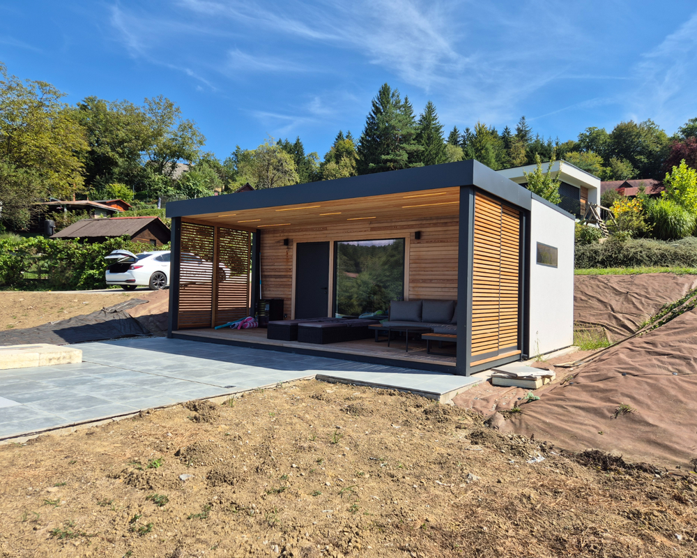 Modularna gradnja poteka v proizvodnji, kjer je hiša v modulih narejena na ključ (končana zunaj in znotraj, urejene vse inštalacije, zaključena kopalnica). Sledi le še postavitev modulov na terenu, kar traja od 1 do 10 dni. 1 dan v primeru 1 modula, več dni v primeru več modulov in dvokapne strehe, nato je hiša vseljiva.
